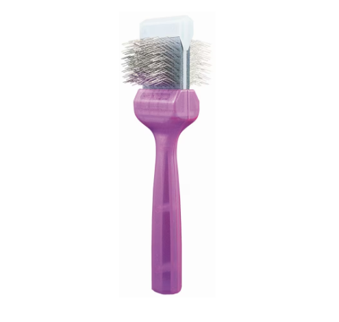 Professionele Activet Paars Enkelborstel voor ontklitten en ontwollen. Flexibele kop, geschikt voor alle vachten en veelgebruikt door trimsalons. Zacht voor de huid – krachtig tegen klitten.