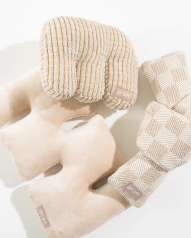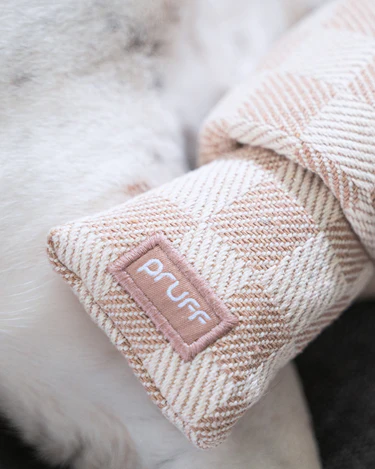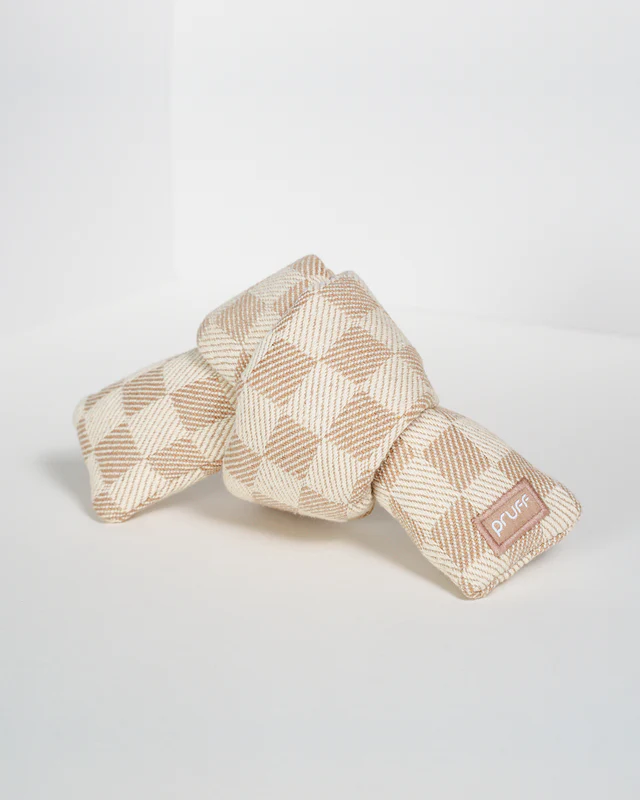 PRUFF’s moderne, minimalistische hondenspeeltje: de Knot knuffel is gemaakt van geweven geruite stof en kan worden vastgeknoopt en losgemaakt. De gekreukelde binnenkant en de uitdaging om los te maken, maken dit neutrale hondenspeeltje perfect voor urenlang speelplezier.