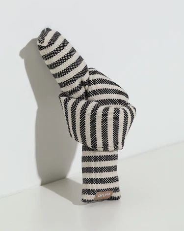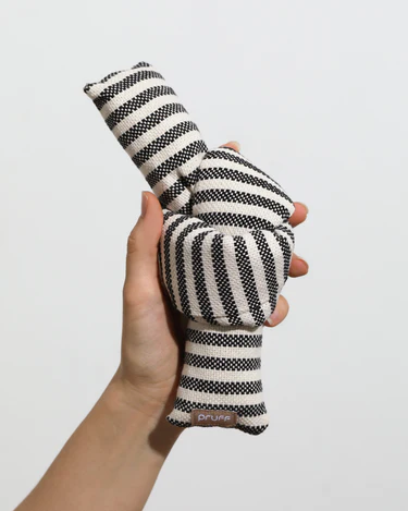 PRUFF’s moderne, minimalistische hondenspeeltje: de Knot knuffel is gemaakt van geweven gestreepte stof en kan worden vastgeknoopt en losgemaakt.